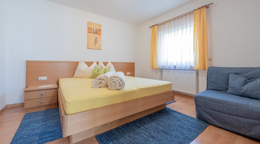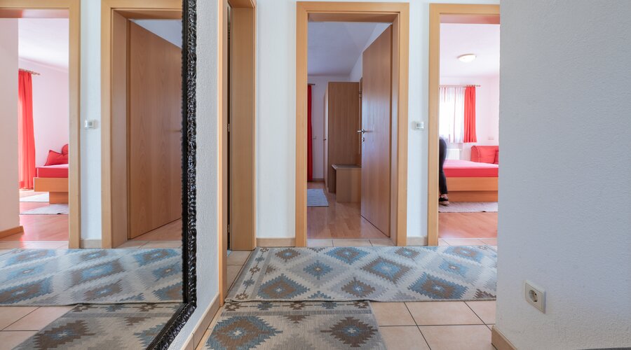 Die Apartments „Monika“ und „Carmen“ bieten alles, was Sie für einen angenehmen Urlaub benötigen. Beide verfügen über zwei gemütliche Schlafzimmer mit jeweils einem Doppelbett sowie eine großzügige Wohnküche, in der eine ausziehbare Couch zusätzlichen Platz schafft. Ein Tages-WC, ein separates Badezimmer und eine praktische Garderobe sorgen für hohen Komfort im Alltag.
