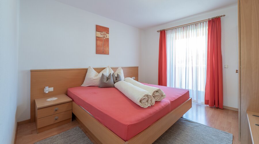 Apartment Monika, featuring a warmly designed red bedroom, is located on the first floor.
