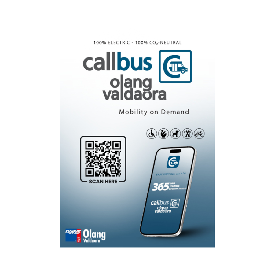 Der CallBus macht nachhaltige Mobilität in Olang einfach, flexibel und nachhaltig. Dank on-demand genau immer dann, wann und wo er gebraucht wird. Ab November 2025 ergänzt er auf Abruf den bestehenden öffentlichen Verkehr und bringt Gäste wie Einheimische direkt ans Ziel – ohne starre Fahrpläne, ohne Auto. Bei Bedarf steht ein barrierefreies Fahrzeug für Menschen mit Beeinträchtigung bereit.
