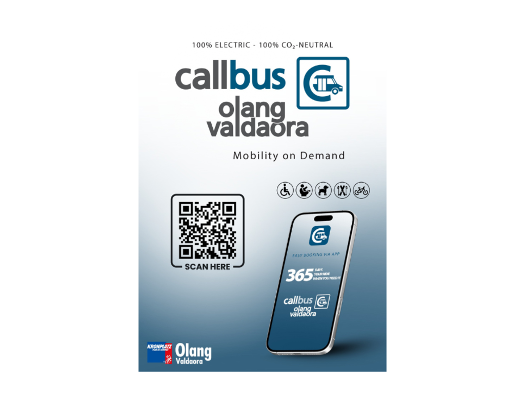 The CallBus is a flexible, electrically powered on-demand service in Olang with more than 90 stops. It can be easily booked via app and complements the existing mobility offer outside fixed timetables. The service is barrier-free, transports bicycles in summer and ski equipment in winter, and offers child seats and dog boxes on request. For holders of the Kronplatz Guest Pass or a südtirolmobil Pass, use of the service is free of charge; all others pay €2 per ride.