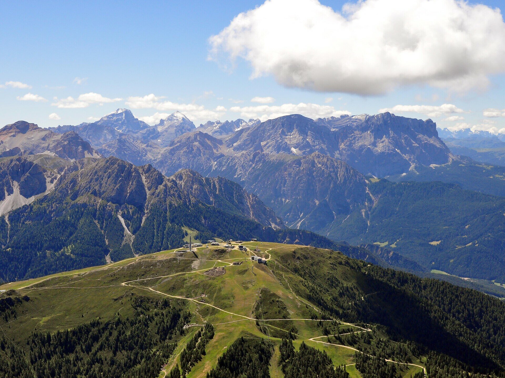 This diverse and challenging hike begins at the base station of the Olang 1+2 cable car. Just before the lift, turn left onto trail no. 3. The path leads through the forest, then crosses a paved road before continuing uphill along trail no. 3. Numerous switchbacks take you past the Oberegger Alm and Lorenzihütte, both great spots for a rest and refreshment. Continue upward to the cable car’s mid-station, where you join the Corones circular trail above the station. Follow it to the right until you reach the summit of Kronplatz.
