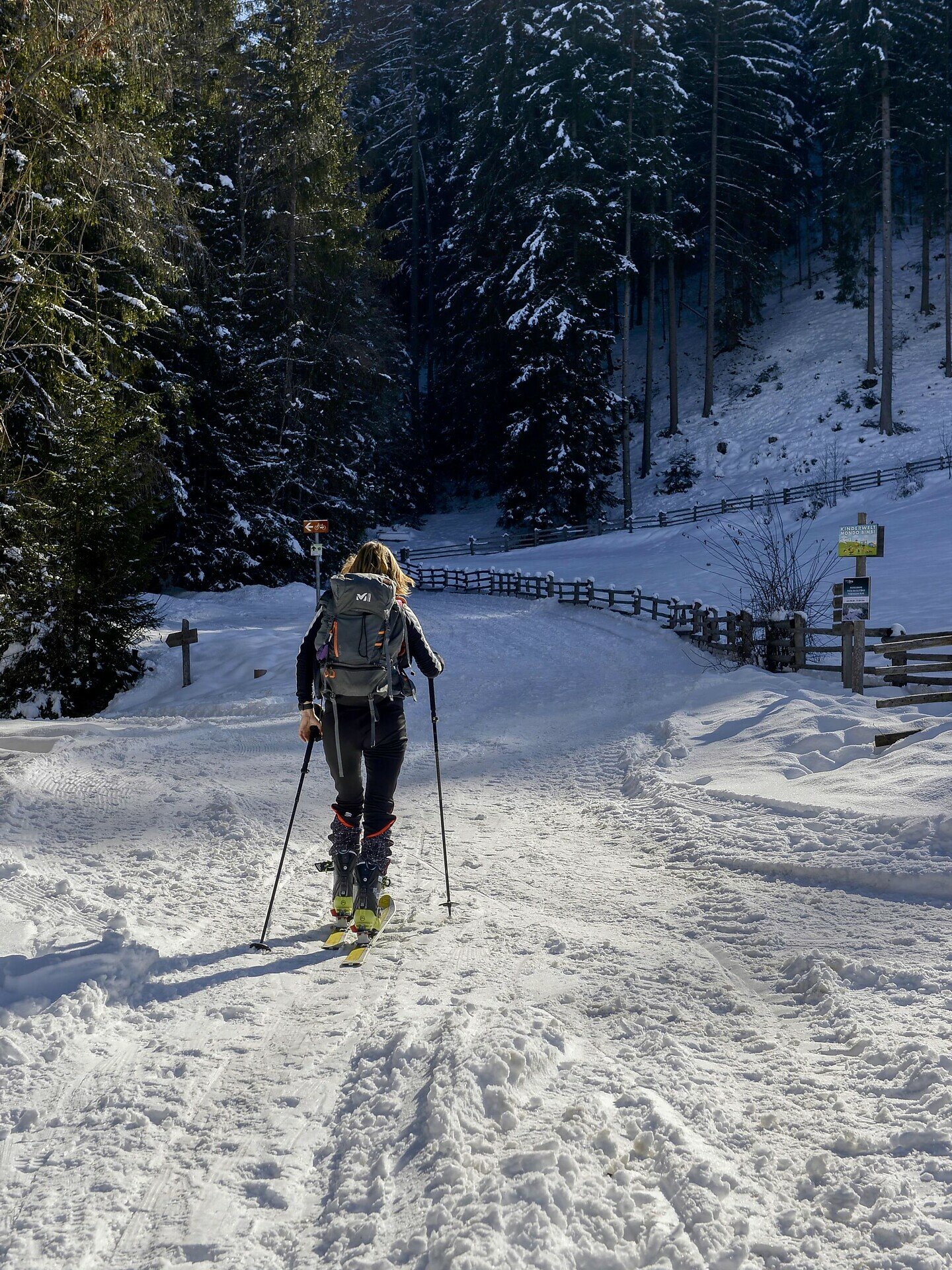 A true hidden gem for nature lovers is the ski touring and tobogganing trail to the Brunstalm, starting right at the Kids World in Oberolang. This enchanting path is groomed weekly with a snowcat and winds its way through the untouched beauty of the Dolomites UNESCO World Heritage site. The trail gently leads up to the Brunstalm, where you can warm up in a cozy room and take in the breathtaking views of the Olang Dolomites. Please note that the trail is closed in the evening due to grooming work.