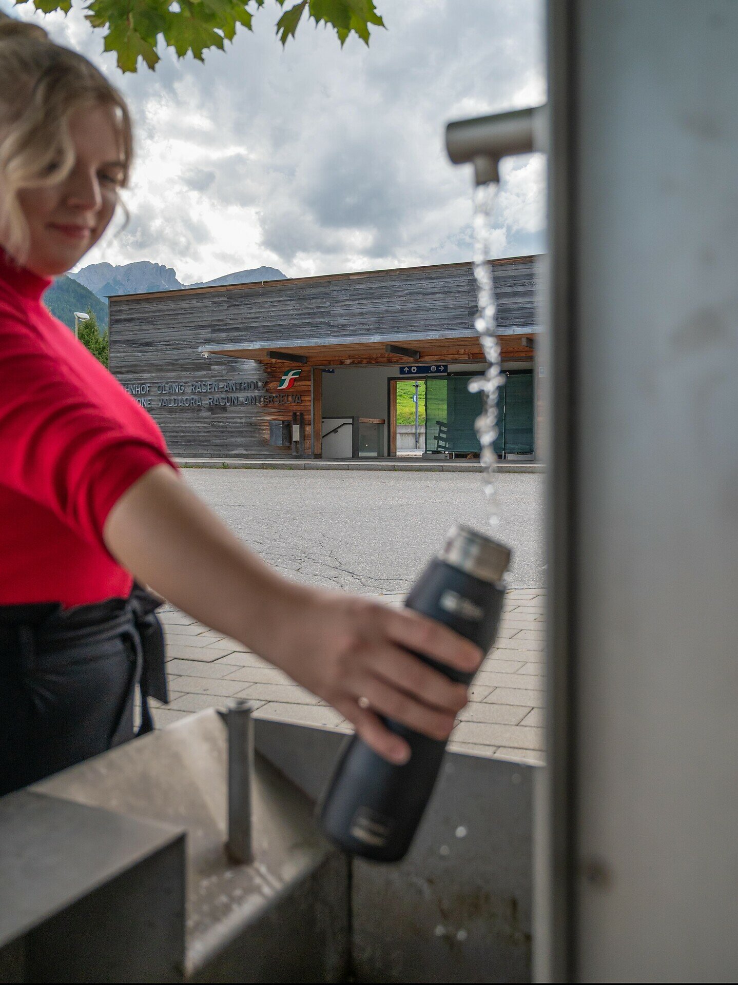 Questa fontana d'acqua potabile si trova direttamente presso la stazione dei treni a Valdaora di Sotto ed è liberamente e gratuitamente accessibile.