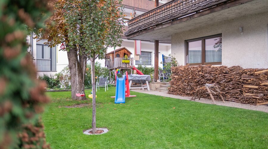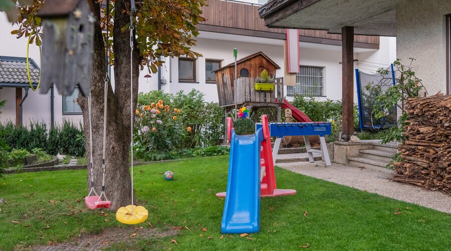Hier können Groß und Klein den Tag an der frischen Bergluft verbringen: Die Kinder toben sich auf dem Trampolin, bei einer Runde Tischtennis oder Calcetto aus, sausen die Spielrutsche hinunter oder schaukeln fröhlich auf der Hutsche.